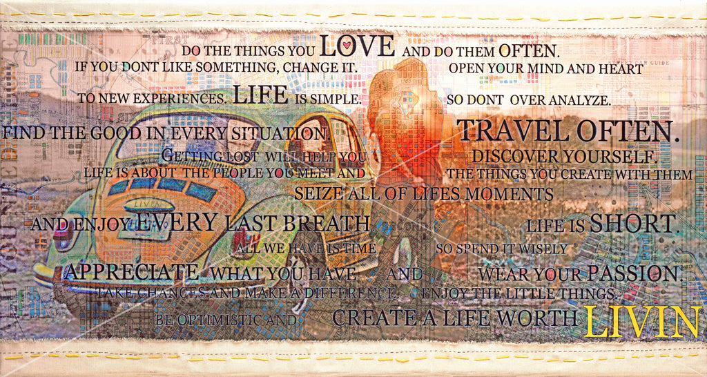 About this item: The LIVIN Philosophy becomes the main focus of this piece. "Do the things you love and do them often. If you don't like something, change it. Open your mind and heart to new people and experiences. Life is simple. So don't over analyze. Find the good in every situation. Travel often. Getting lost will help you discover yourself. Life is about the people you meet and the things you create with them. Seize all of life's moments and enjoy every last breath. Life is short. All we have is time so spend it wisely and appreciate what you have. Wear your passion. Take chances and make a difference. Enjoy the little things. Be optimistic and create a life worth LIVIN."© -Jeremy Wiseman